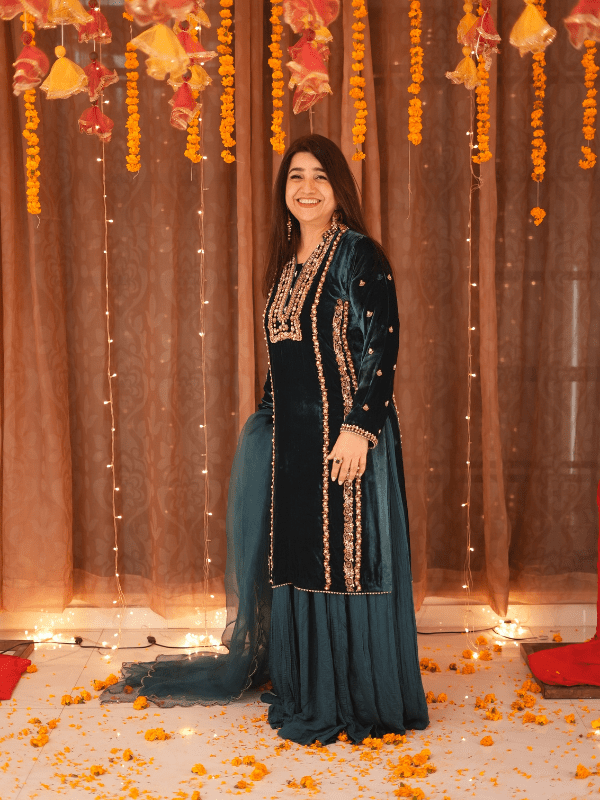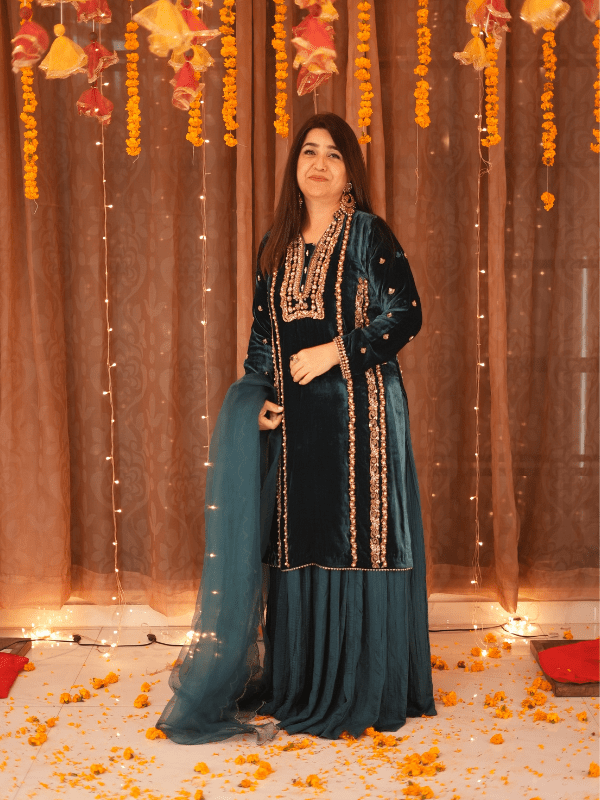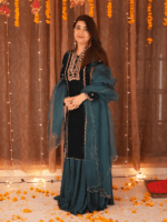 This exquisite velvet dress is a perfect blend of elegance and luxury, featuring a rich, soft fabric that exudes warmth and sophistication. Paired with a delicate pure organza dupatta, it adds a graceful, airy touch to the ensemble. For an added flair, the dress can be complemented with a matching sharara, creating a stunning, flowy silhouette. Ideal for special occasions, this outfit effortlessly combines opulence with timeless charm.